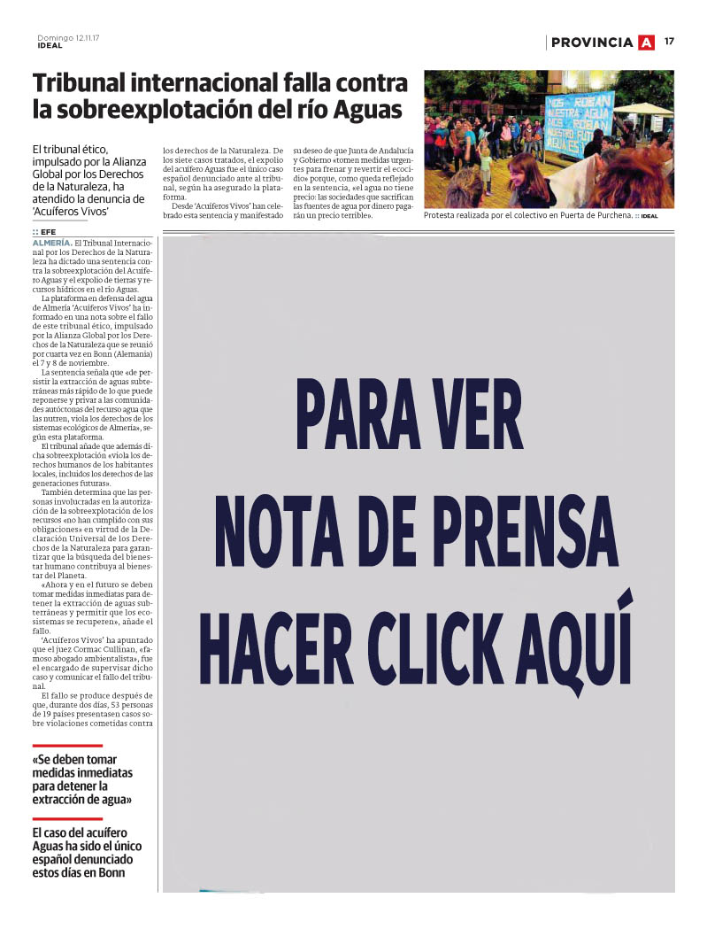 El Tribunal Internacional por los Derechos de la Naturaleza ha dictado una sentencia contra la sobreexplotación del Acuífero Aguas y el expolio de tierras y recursos hídricos en el río Aguas, una reivindicación canalizada por la Plataforma Acuiferos Vivos de la que forma parte activa el Grupo Ecologista Mediterráneo.